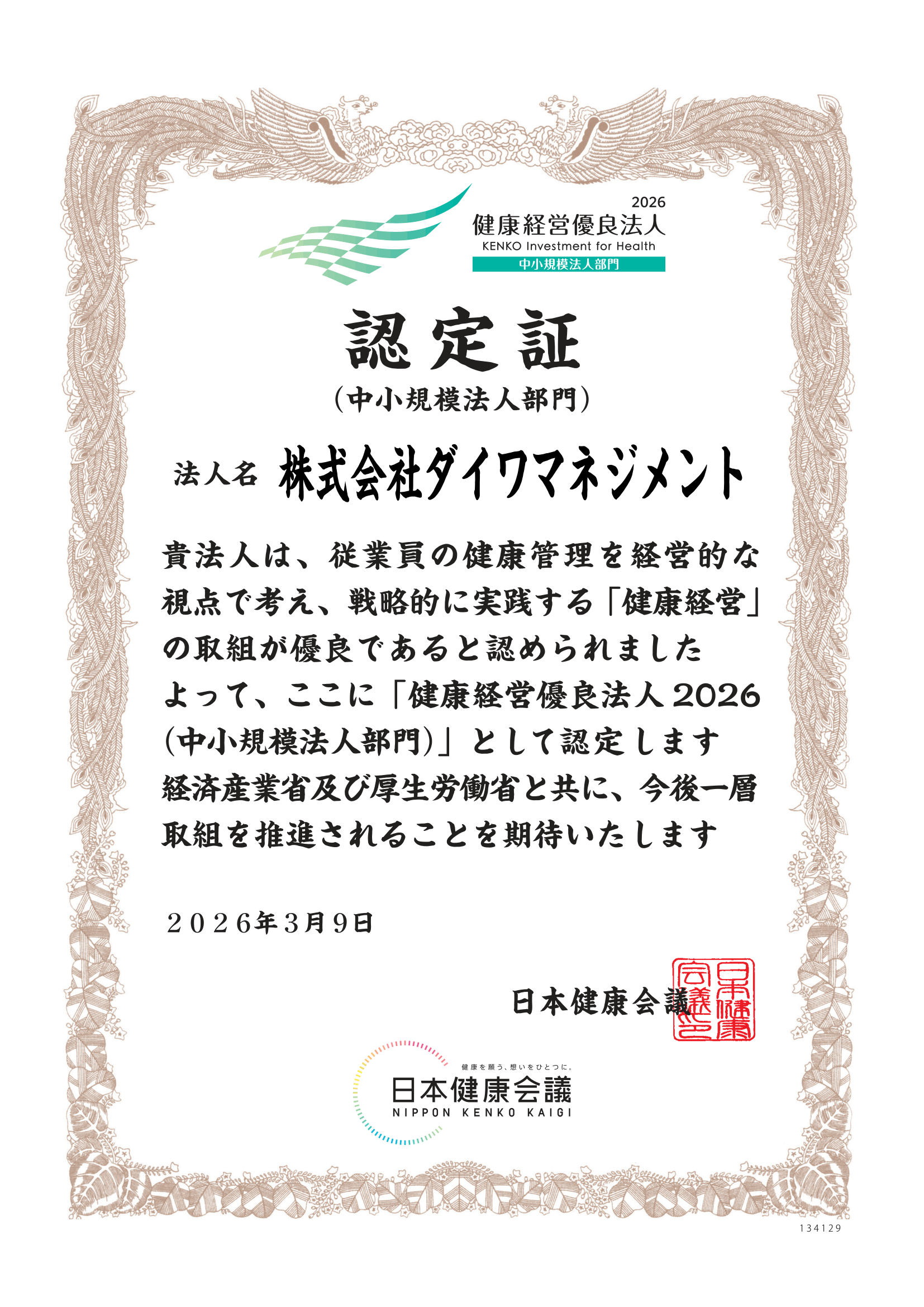 このたび当社は、「健康経営優良法人2026(中小規模法人部門)」として認定されました。